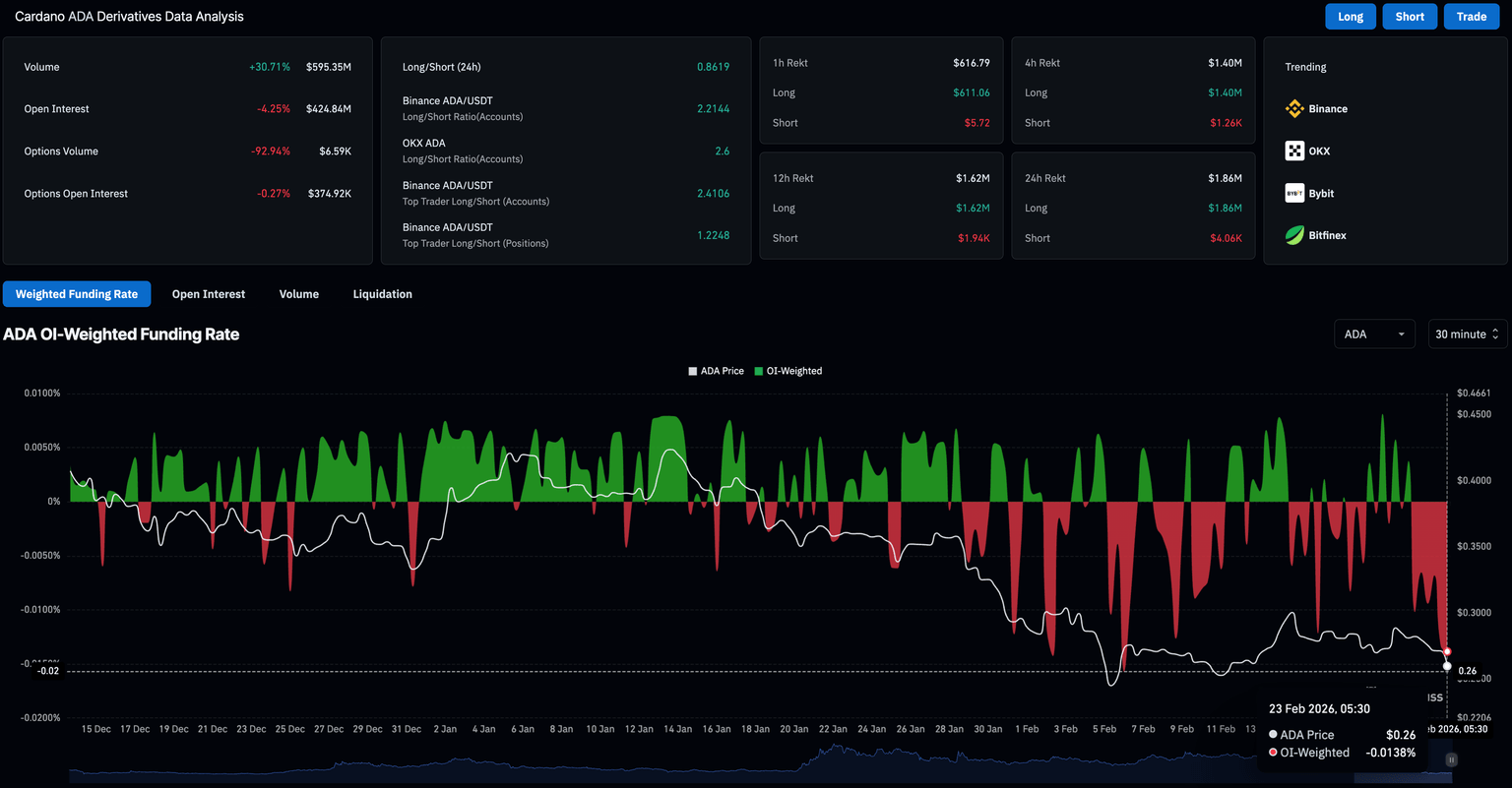 Los datos de CoinGlass muestran que el Interés Abierto (OI) de los futuros de ADA se sitúa en 424.84 millones de dólares, un 4.25% menos en las últimas 24 horas, lo que sugiere un retiro significativo de capital en medio del sentimiento de aversión al riesgo entre los operadores.