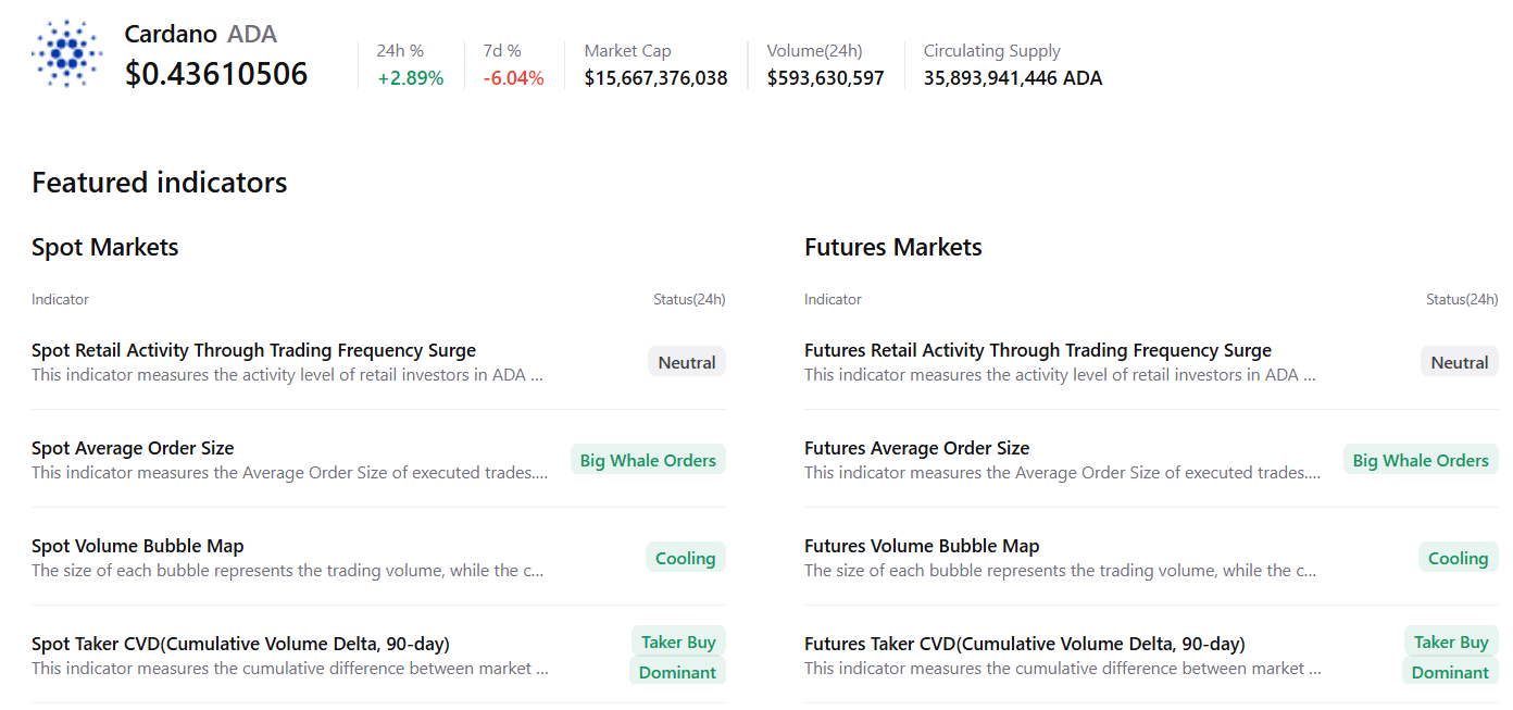 Los datos resumidos de CryptoQuant respaldan la perspectiva alcista, ya que los mercados al contado y de futuros de Cardano muestran grandes órdenes de ballenas, condiciones de enfriamiento y dominio de compra. Estos factores señalan una posible recuperación en los próximos días.