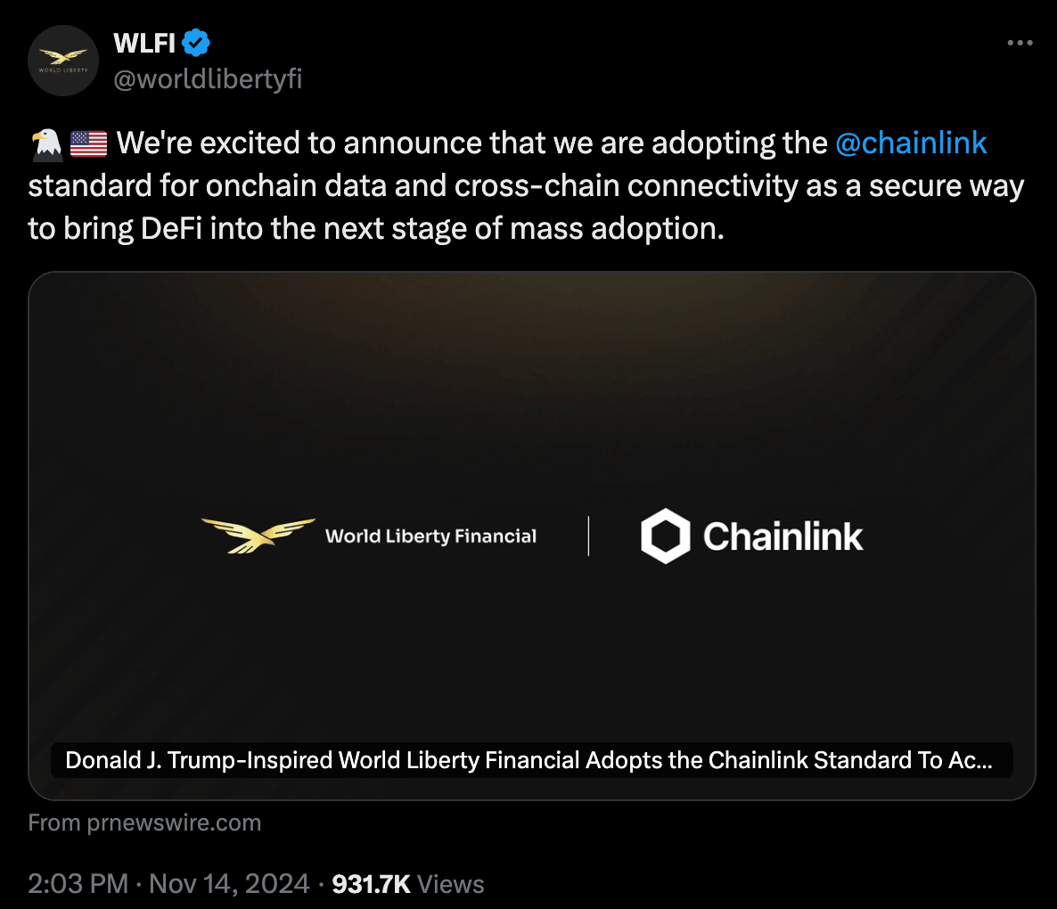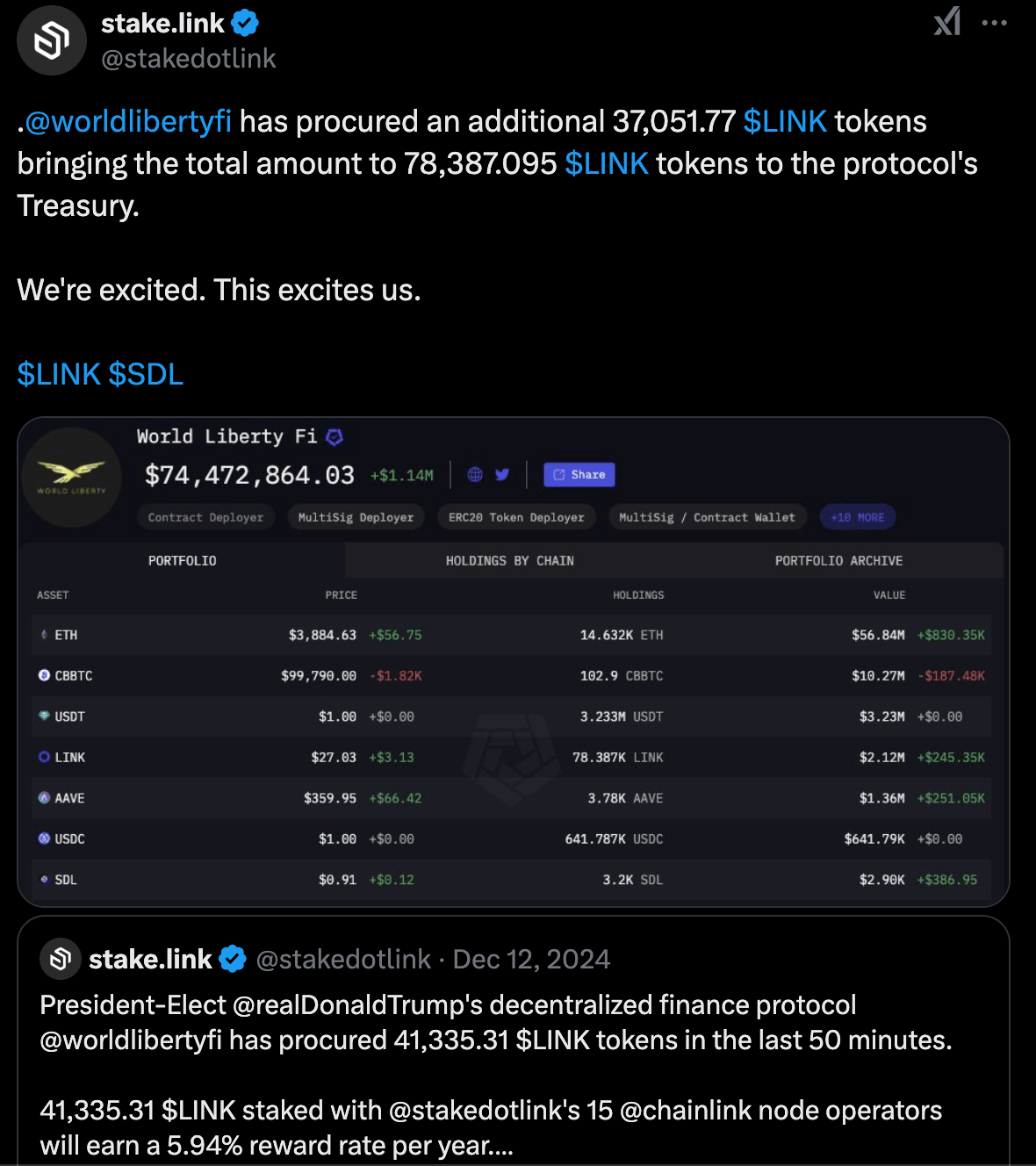 - El mes pasado, World Liberty Financial, respaldada por Donald Trump, invirtió 4.7 millones de dólares en LINK antes de adoptar oficialmente el estándar de oráculo de Chainlink.