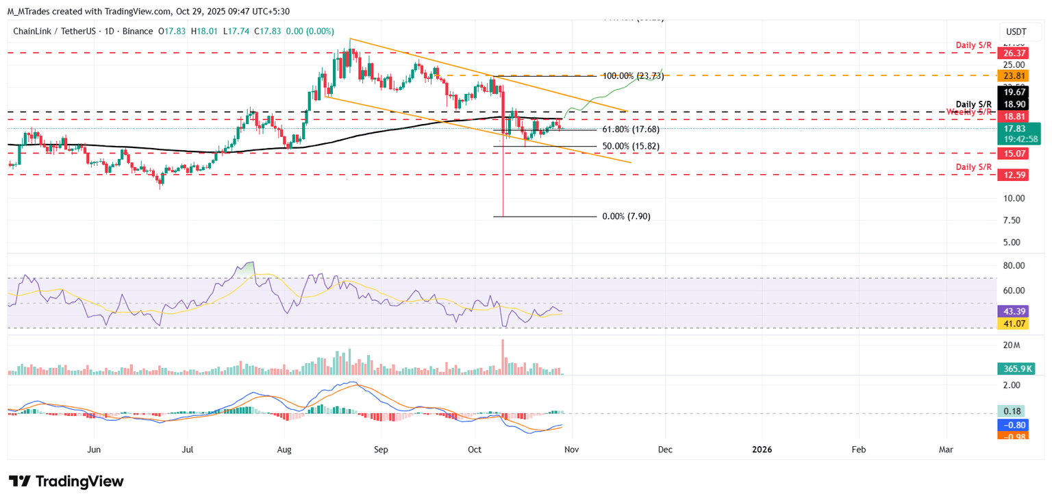 El precio de Chainlink enfrentó un rechazo de su media móvil exponencial (EMA) de 200 días en 18.90$ el lunes y cayó casi un 4% al día siguiente. En el momento de escribir el miércoles, ronda alrededor de 17.83$, encontrando soporte alrededor del nivel de retroceso de Fibonacci del 61.8% en 17.68$.