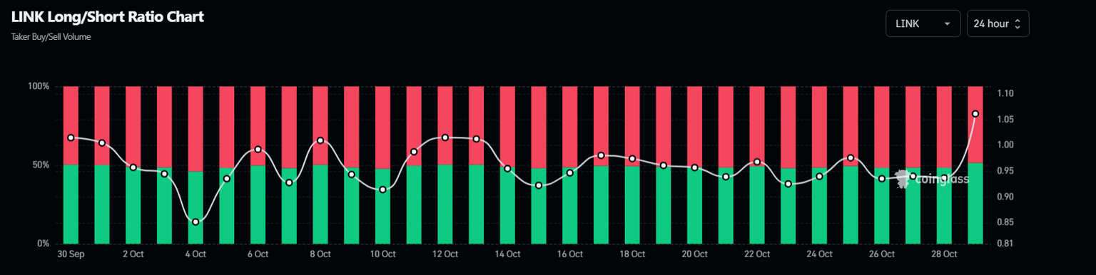 En el lado de los derivados, la relación larga-corta de Coinglass para LINK es de 1.06 el miércoles, el nivel más alto en más de un mes. La relación por encima de uno sugiere que más operadores están apostando a que el precio de Chainlink suba.