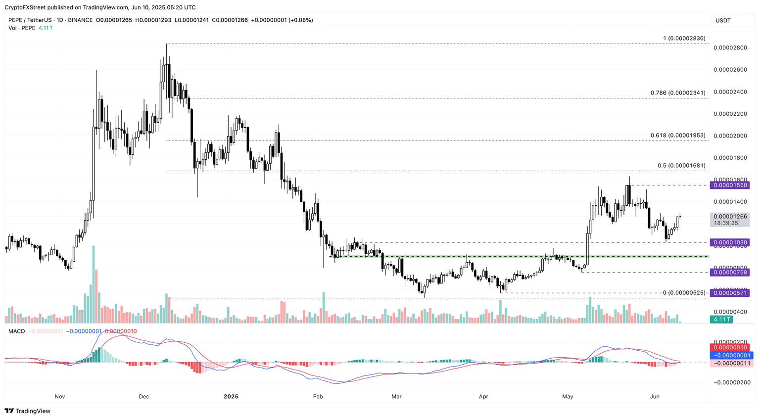 En el momento de escribir, PEPE se negocia a 0.00001253$ por debajo del nivel de Fibonacci del 50% en 0.00001681$, retrocedido desde el máximo histórico en 0.00002836$ hasta el mínimo del año en 0.00000525$.