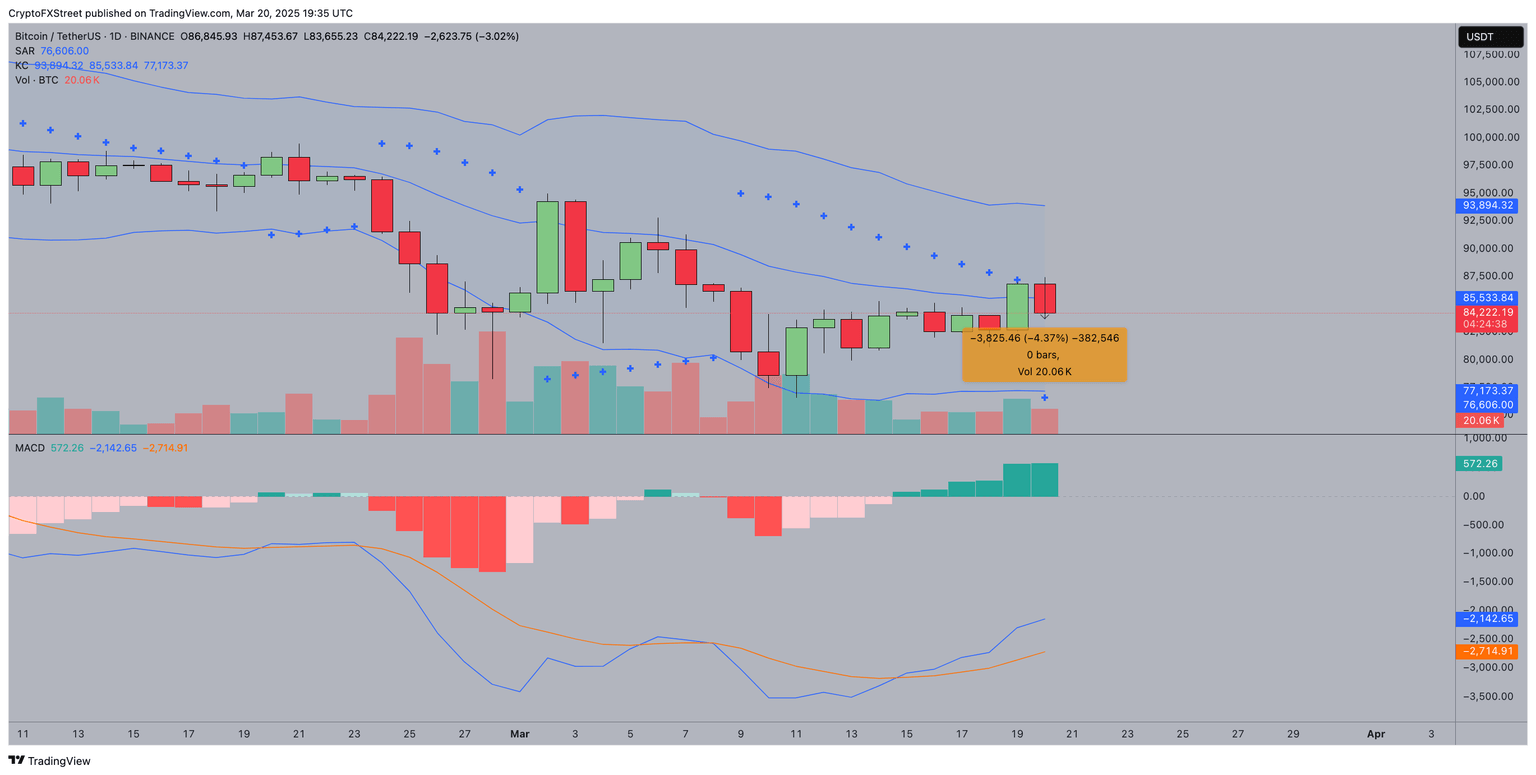 El indicador Parabolic SAR, que rastrea la dirección de la tendencia, permanece por debajo de la acción del precio del BTC, reflejando un soporte alcista subyacente.