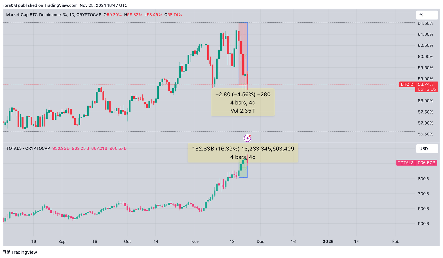 Después de tres días consecutivos de declive, la métrica BTC.D ahora lee 58.7% en el momento de la publicación el lunes 25 de noviembre.