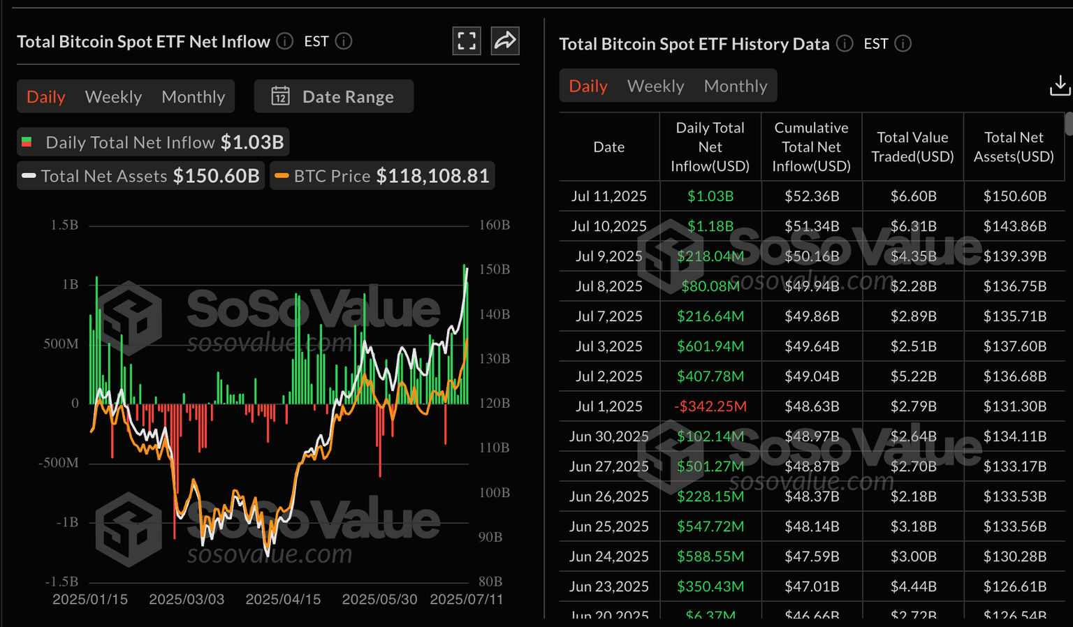 Notablemente, los ETFs al contado de BTC experimentaron un aumento prolongado en la entrada neta diaria, con ligeramente más de 1.000 millones de dólares registrados el viernes. El IBIT de BlackRock fue el ETF de mejor rendimiento en EE. UU., con un volumen de entrada neta que promedió 953.5 millones de dólares. El total acumulado de entradas se sitúa actualmente en 52.400 millones de dólares, con activos netos de 150.600 millones de dólares, según SoSoValue.