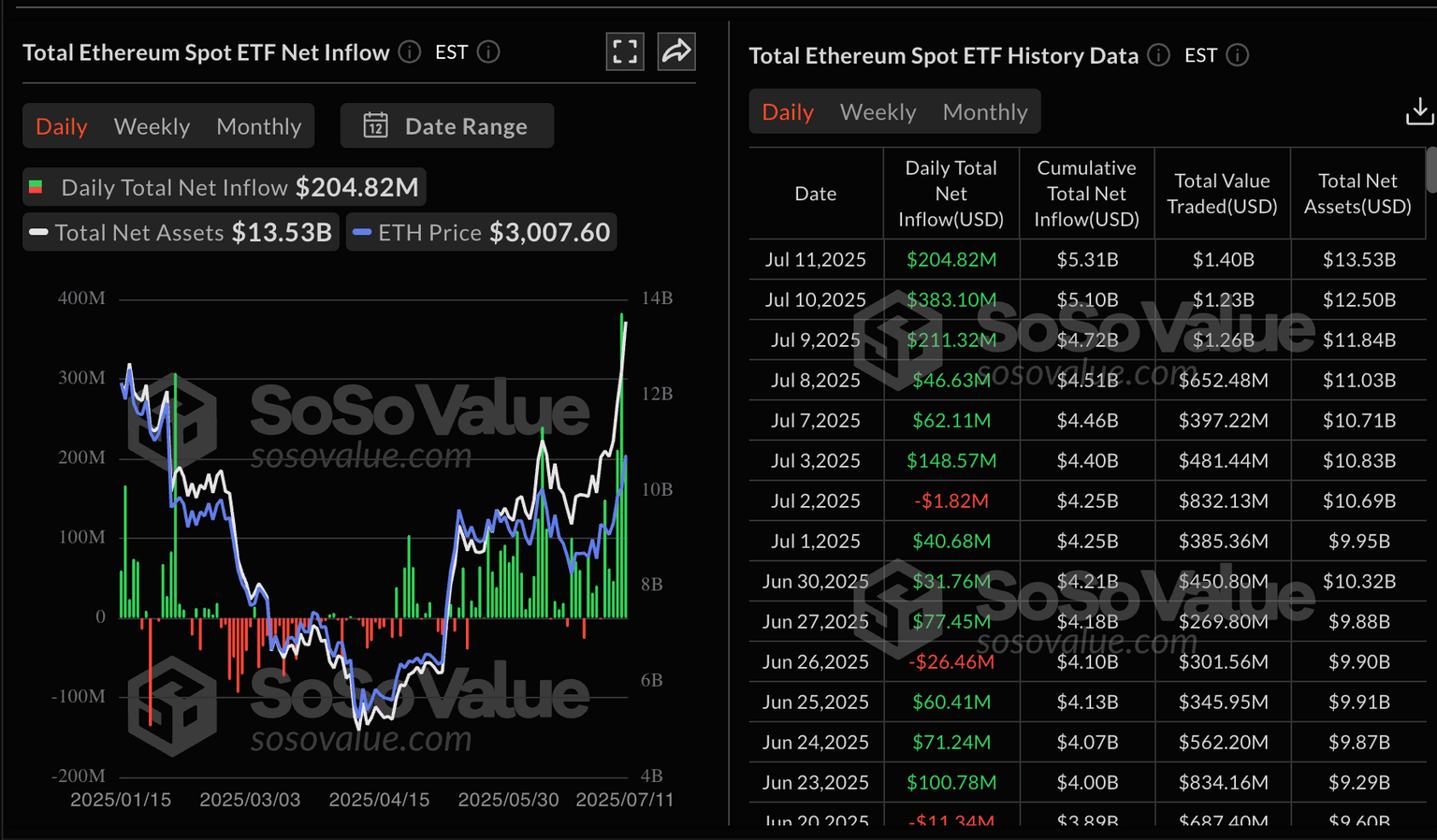 CoinShares destaca el interés constante en productos de inversión relacionados con Ethereum, considerando los 990 millones de dólares en entrada neta semanal. Esto representa la 12ª semana consecutiva de entradas de ETH y la cuarta más grande en la historia. Los datos de SoSoValue muestran que los ETFs al contado de Ethereum registraron aproximadamente 205 millones de dólares en entrada neta diaria el viernes, con un total acumulado que promedia 5.300 millones de dólares.