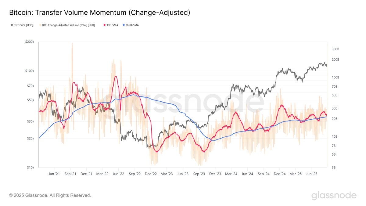 Según Glassnode, el Bitcoin enfrenta un retroceso en el promedio mensual del volumen de transferencias ajustado por cambios de aproximadamente 26.700 millones de dólares a 23.200 millones de dólares. Si la corrección se extiende por debajo del promedio anual de 21.600 millones de dólares, confirmará que la actividad especulativa se está reduciendo e indicará una contracción más amplia en la demanda en cadena.
