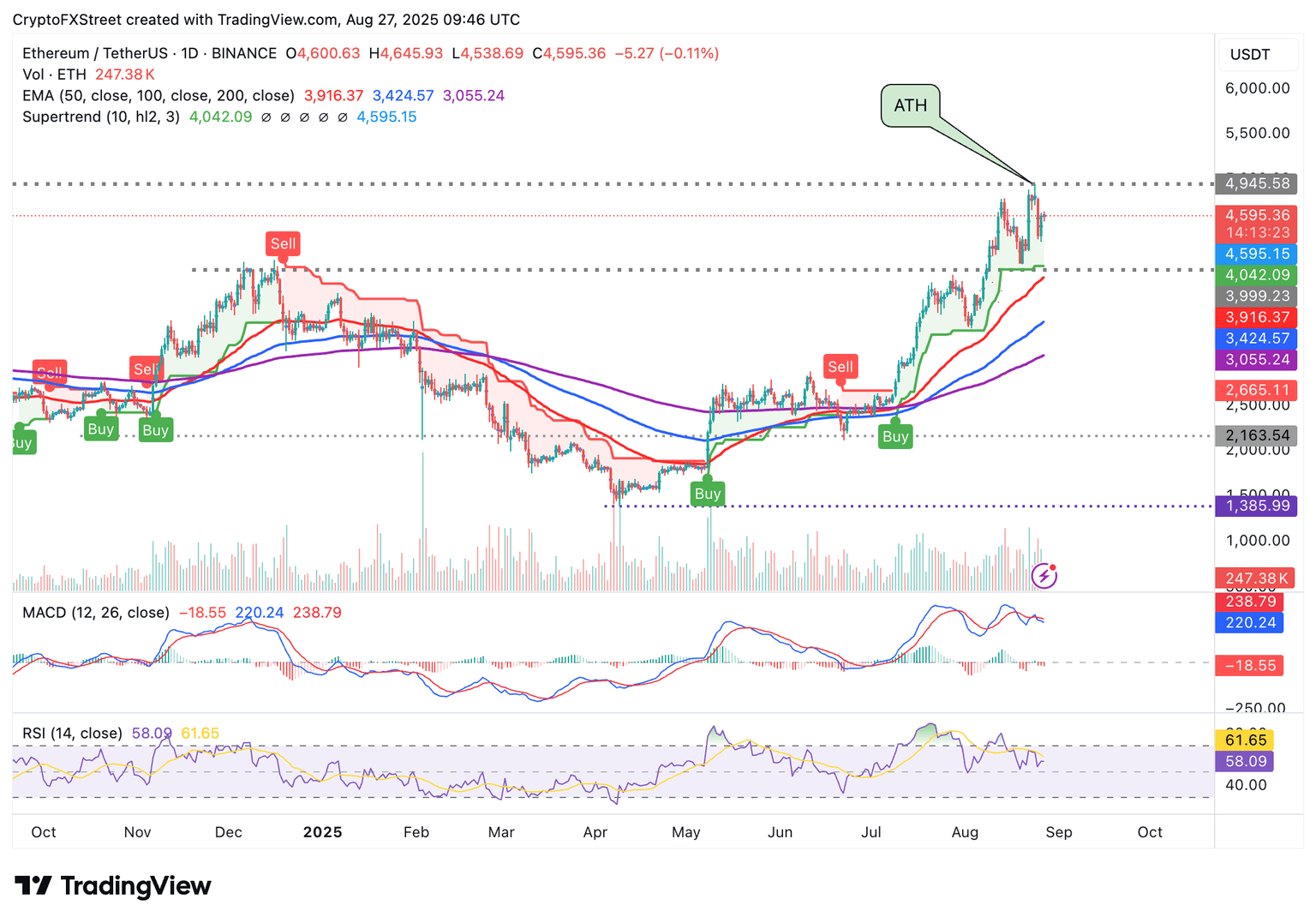 El precio de Ethereum está cotizando por encima de 4.600$ en el momento de escribir, impulsado por un sentimiento positivo y una demanda institucional constante. A pesar del sentimiento alcista, los microindicadores como el MACD y el RSI sugieren que el descenso podría continuar a corto plazo.
