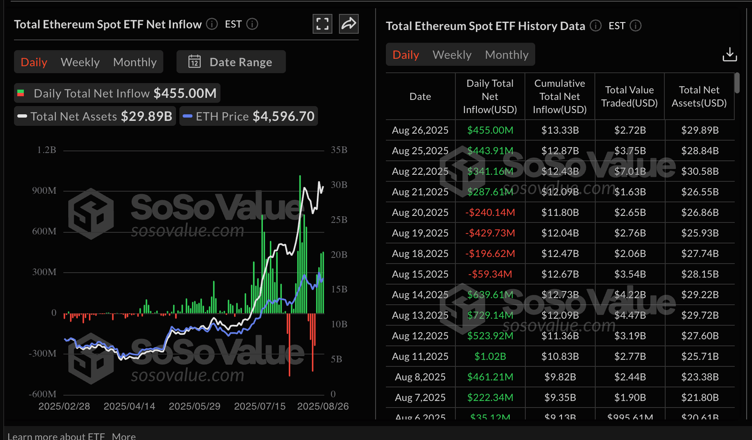 Ethereum, por otro lado, cuenta con una tasa de entrada de ETF al contado más fuerte, con entradas estabilizándose desde el jueves. A pesar de que el precio de ETH alcanzó un nuevo récord de 4.955$, la demanda institucional sigue siendo elevada, respaldada por los 455 millones de dólares en entradas el martes, llevando el total de entradas netas semanales a 899 millones de dólares hasta ahora. Los ETFs de Ethereum experimentaron salidas netas de 238 millones de dólares la semana anterior.