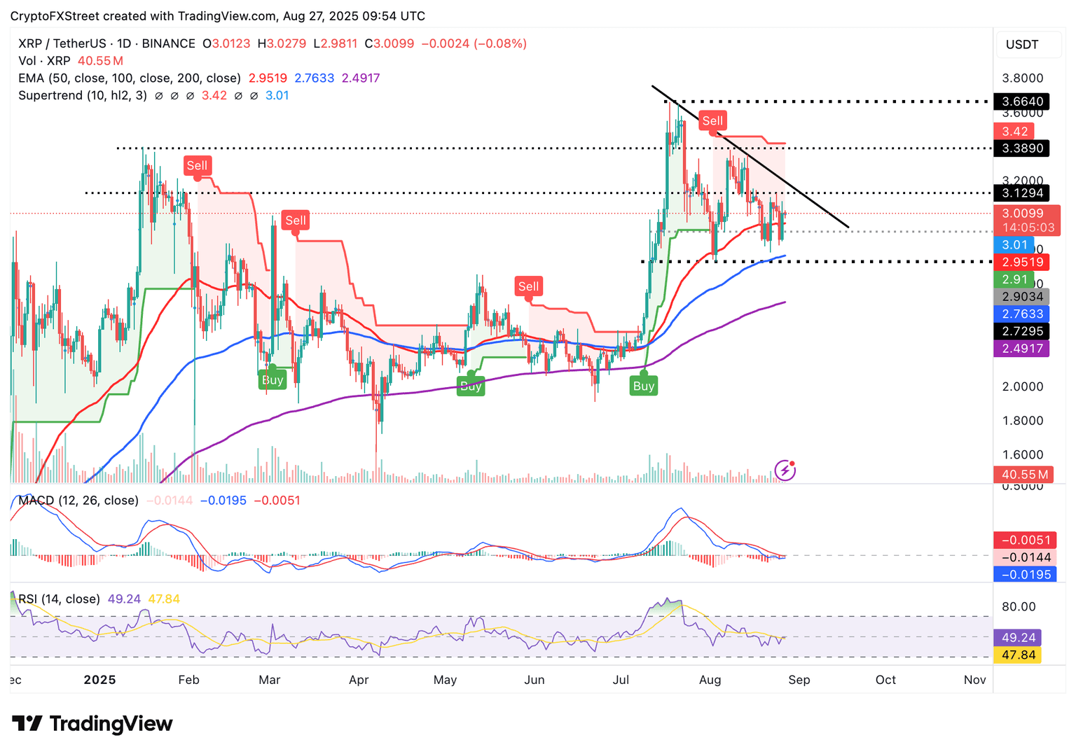 Si el RSI gana impulso por encima de la línea media y la línea azul del MACD cruza por encima de la línea de señal roja, el camino de menor resistencia podría permanecer al alza, aumentando las posibilidades de que XRP extienda su recuperación por encima del obstáculo a corto plazo en 3.12$, probado el domingo y 3.38$, probado el 8 de agosto.