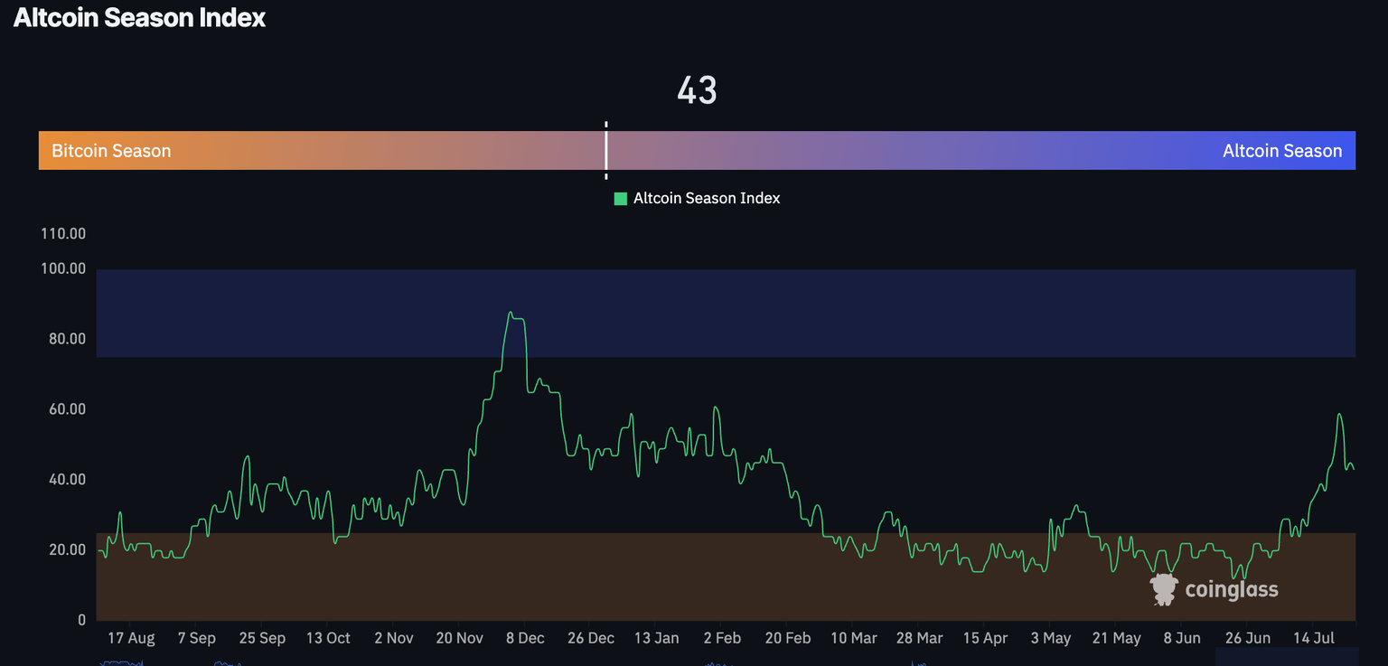 Una mirada al Índice de Temporada de Altcoins sugiere una pausa en el rally de las altcoins. Los datos de CoinGlass muestran que el índice retrocedió a 43 después de alcanzar un máximo de 59 el lunes, casi tres veces el valor de 20 del 1 de julio. No es la temporada de altcoins hasta que el índice alcance 75, lo que indica una rotación de capital agresiva de Bitcoin hacia otros tokens.