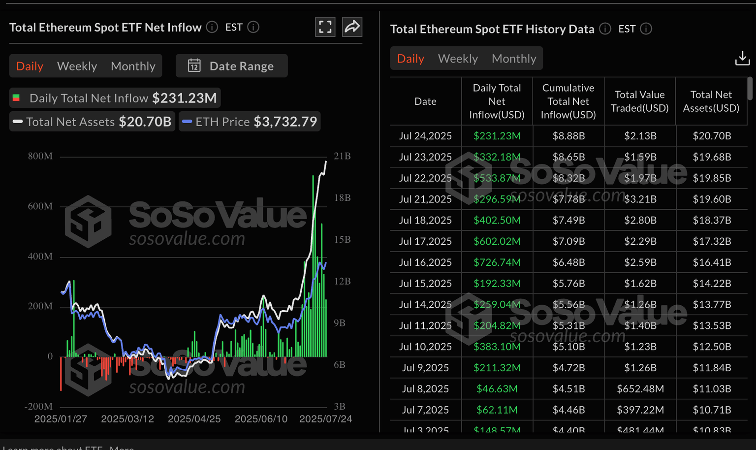 Los fondos cotizados en bolsa (ETFs) de Ethereum al contado continúan registrando flujos constantes a pesar de los vientos en contra en el mercado de criptomonedas. Según SoSoValue, los productos de inversión licenciados en los Estados Unidos (EE.UU.) experimentaron un flujo neto diario de 231 millones de dólares el jueves, que cayó por debajo del flujo de capital del miércoles de 332 millones de dólares. Actualmente, el flujo neto acumulado total se sitúa en 8.880 millones de dólares, con activos netos promediando 20.700 millones de dólares.
