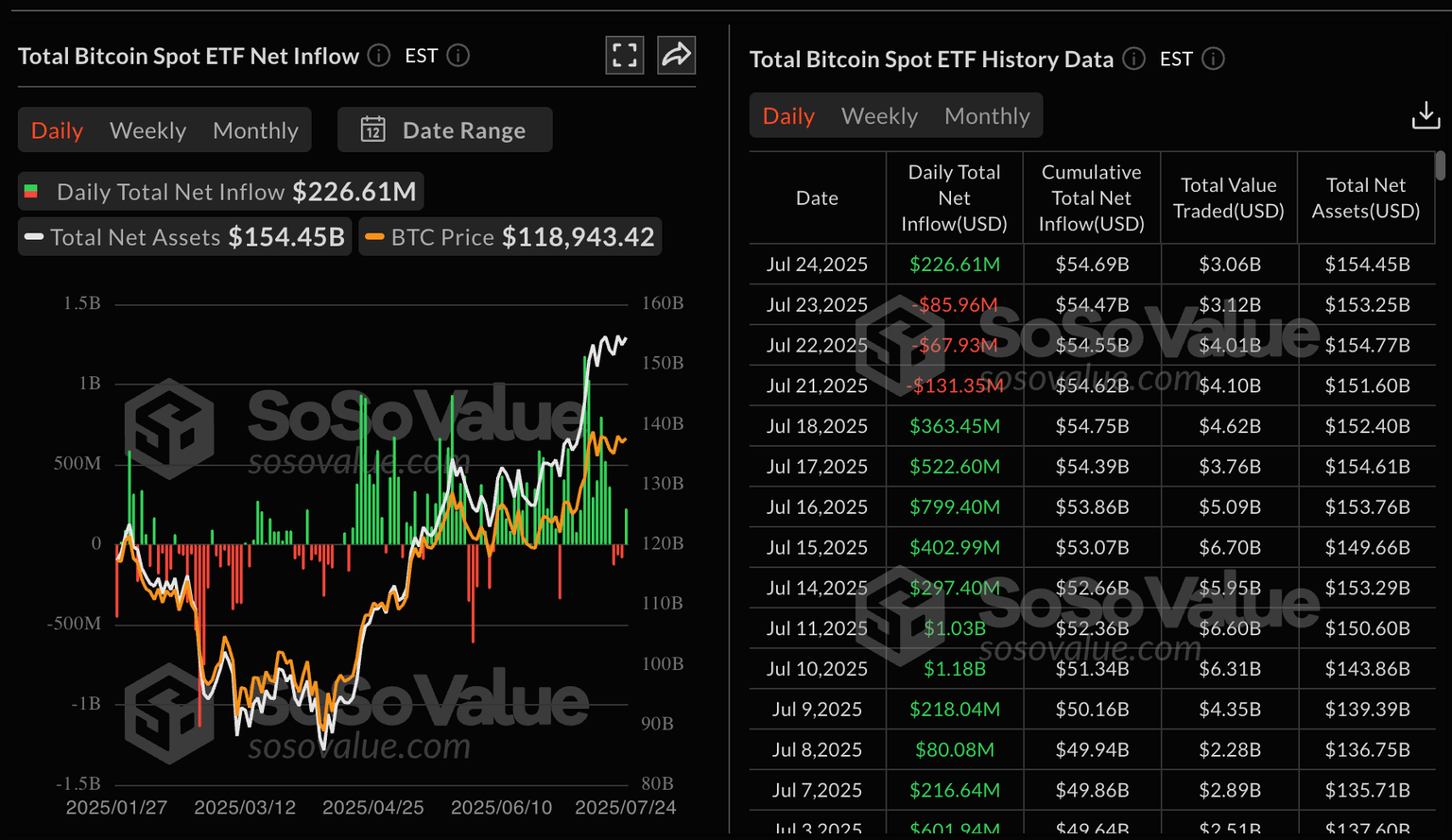Los ETFs de Bitcoin al contado registraron su primer volumen de flujo neto esta semana, aproximadamente 227 millones de dólares el jueves, señalando una mejora en el sentimiento. Supongamos que los inversores anticipan volatilidad en el Dólar estadounidense (USD) debido a la implementación de los aranceles más altos del presidente Donald Trump el 1 de agosto. En ese caso, es probable que busquen exposición a activos de cobertura como Bitcoin y Oro, manteniendo así los precios cerca del máximo histórico.