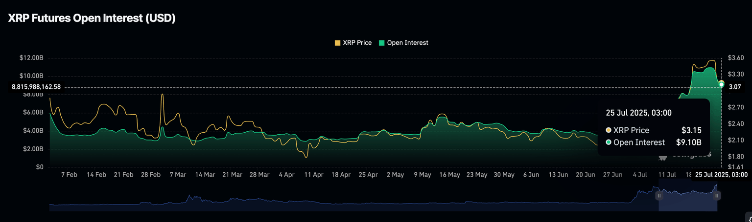 A pesar de una mejora en la imagen técnica a corto plazo, los fundamentos de XRP muestran debilidad, particularmente en el interés abierto de futuros y las tasas de financiación, que han retrocedido en los últimos días. Dicho esto, podría ser prematuro descartar una corrección por debajo del soporte de 3.07$, lo que podría ampliar el alcance bajista hacia la EMA de 200 períodos en 2.80$, probada el 15 de julio.