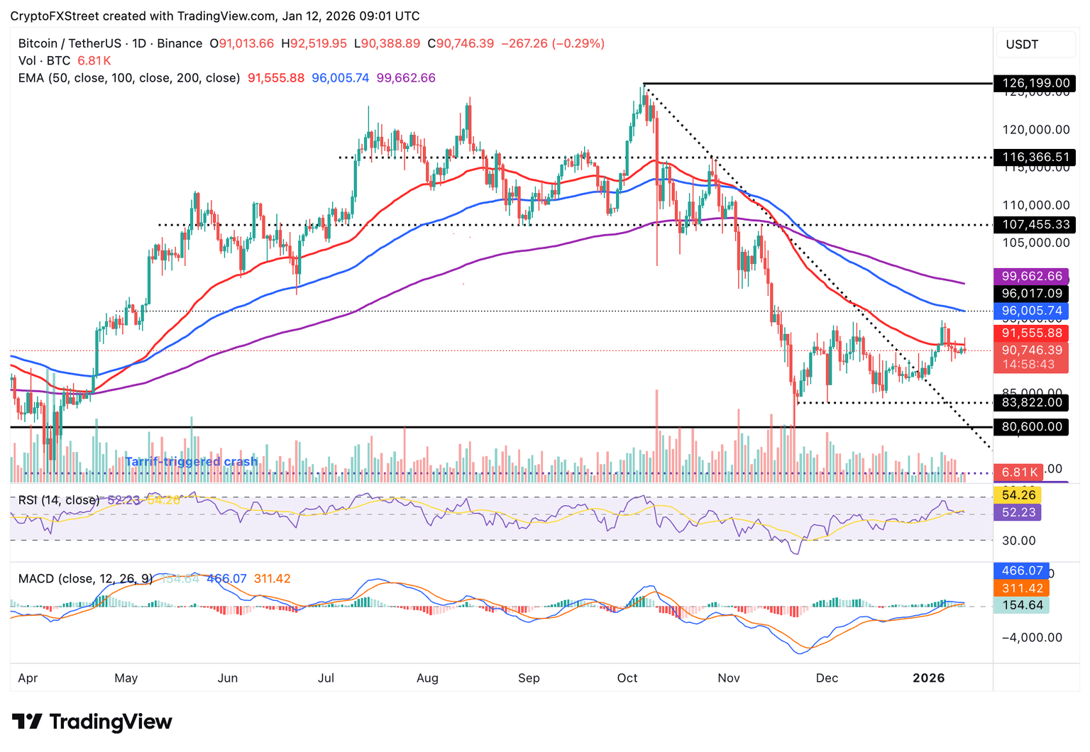 Gráfico del día: Bitcoin cotiza bajo presión mientras el soporte se mantiene