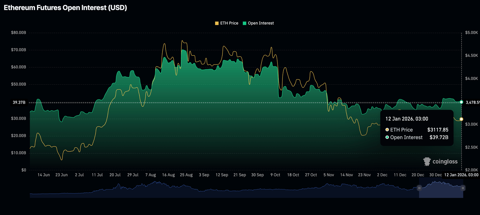 Sin embargo, los datos de CoinGlass muestran que la demanda minorista se está reduciendo, como lo demuestra la caída del Interés Abierto (OI) de futuros a 39.72 mil millones de dólares el lunes, desde 40 mil millones de dólares el domingo. La demanda de derivados de ETH ha estado disminuyendo gradualmente desde el comienzo del año, cuando el OI promedió 41.89 mil millones de dólares el 3 de enero.