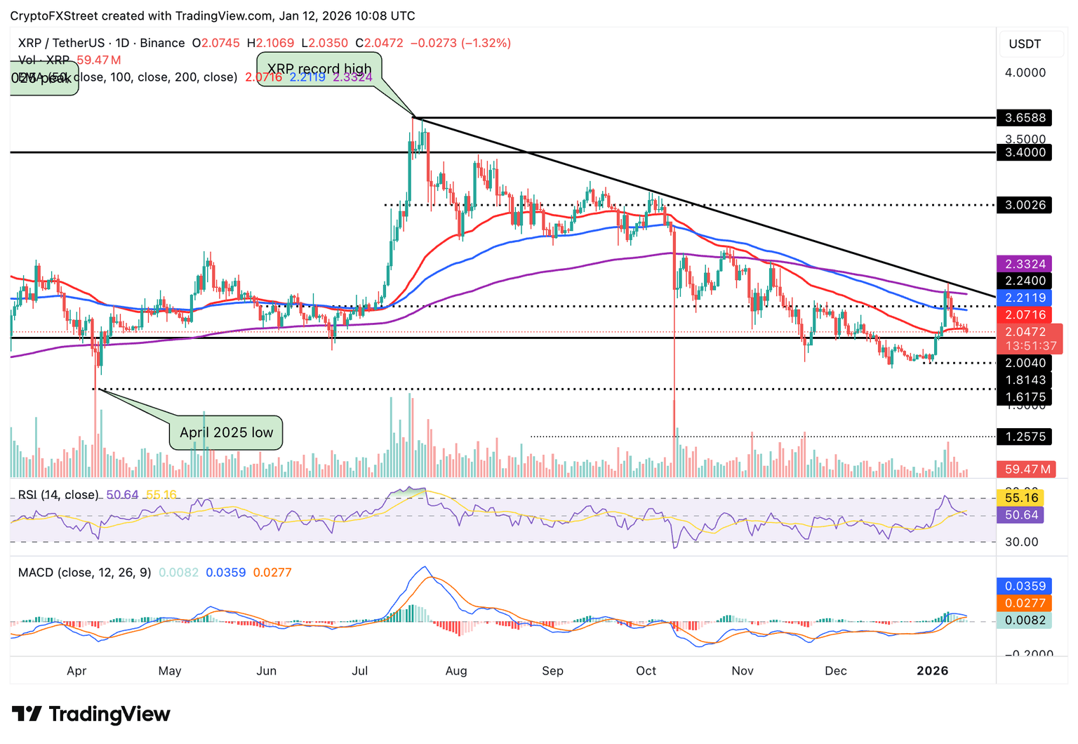 Mientras tanto, la perspectiva técnica de XRP sigue siendo débil, con el precio deslizándose por debajo de la EMA de 50 días en 2.07$ en el momento de escribir el lunes. El RSI en 50 en el gráfico diario está cayendo hacia la región bajista, indicando que el impulso alcista se está desvaneciendo.