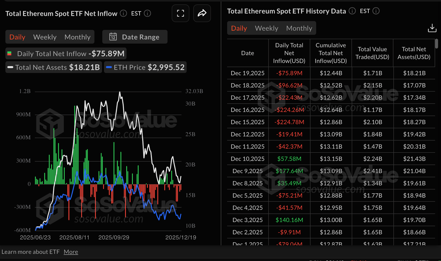 Los ETF de Ethereum también registraron salidas de casi 76 millones de dólares el viernes. Ethereum ha sostenido siete días consecutivos de salidas, reflejando el sentimiento bajista más amplio en el mercado de criptomonedas. La entrada neta acumulada se sitúa en 12.44 mil millones de dólares con activos netos de 18.21 mil millones de dólares.