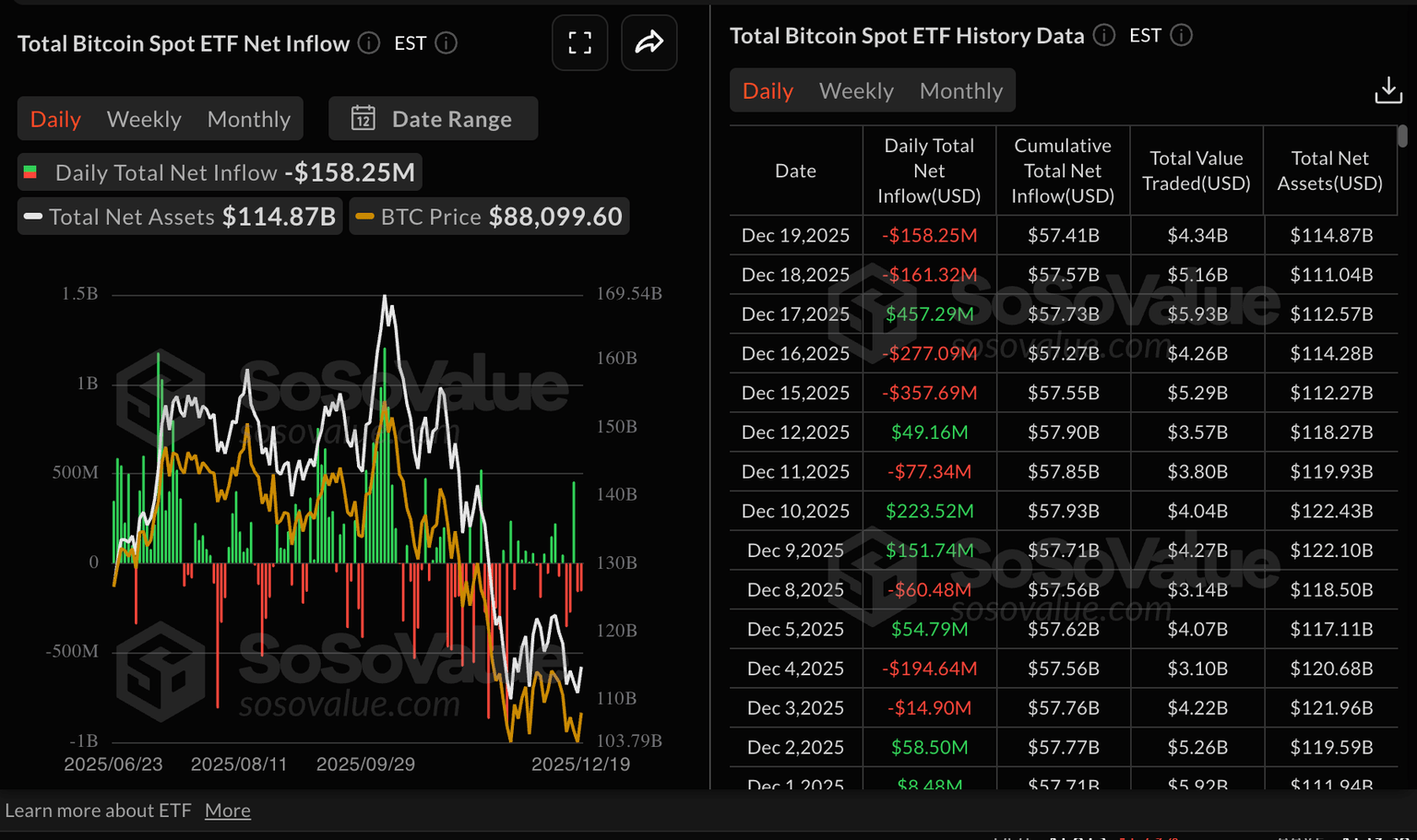 El Bitcoin ha continuado enfrentando una caída significativa en el interés institucional, con la demanda de fondos cotizados en bolsa (ETF) al contado tomando un segundo plano. Los ETF de Bitcoin listados en EE.UU. registraron aproximadamente 158 millones de dólares en salidas el viernes.