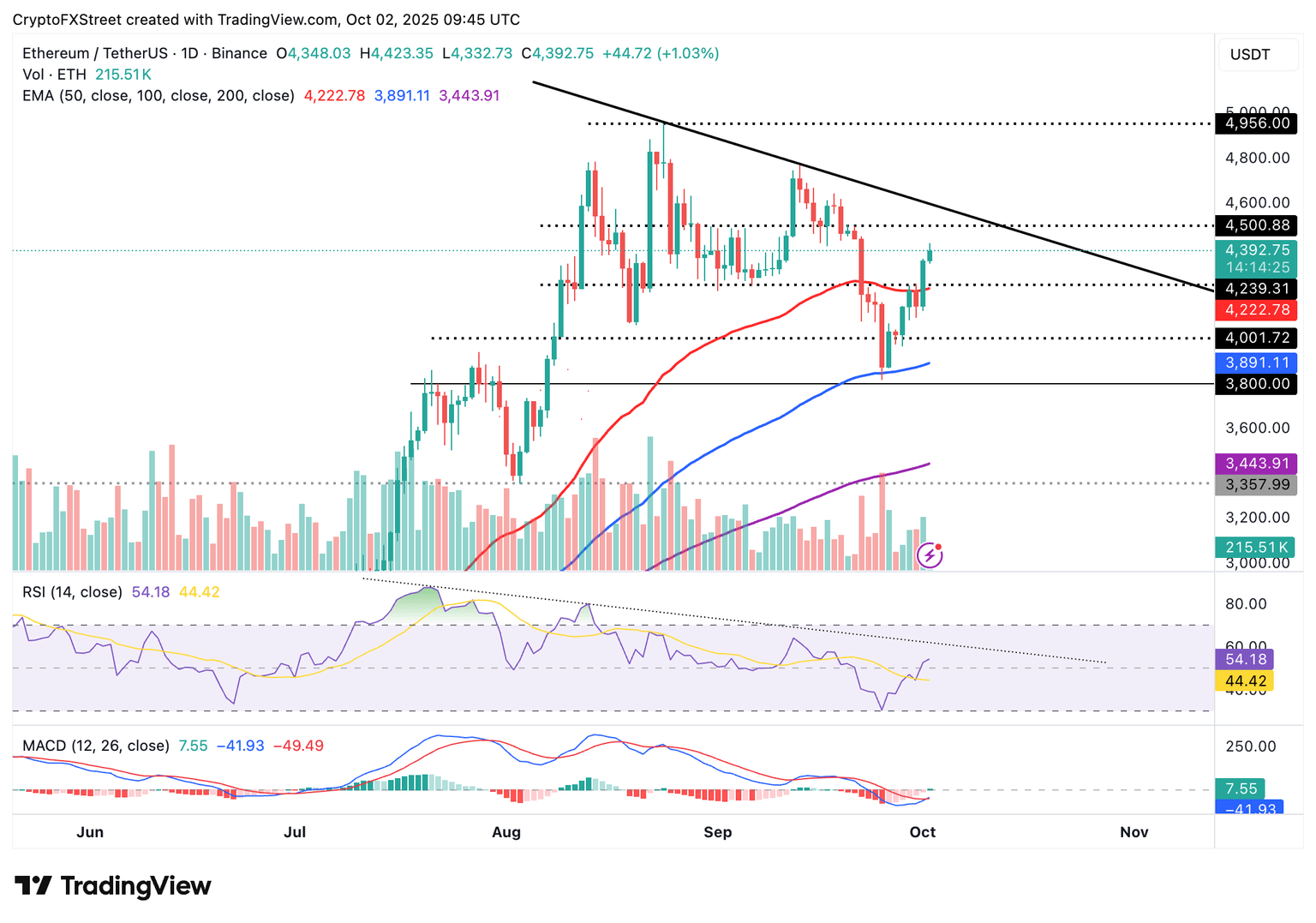 El próximo impulso podría llevar el precio de ETH cerca de su máximo histórico de 4.956$, alcanzado el 24 de agosto. Un RSI en tendencia ascendente en 54 y una señal de compra del indicador MACD en el gráfico diario refuerzan el fuerte control alcista. Los operadores considerarán aumentar la exposición al riesgo, con la línea azul potencialmente permaneciendo por encima de la línea de señal roja. Otro hito crítico para Ethereum sería romper por encima de la línea de tendencia descendente, que ha estado en su lugar en el gráfico diario desde finales de agosto.