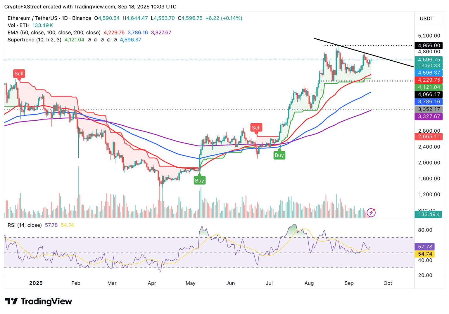 Ethereum está a punto de romper por encima de una resistencia de línea de tendencia descendente, que ha estado en vigor desde que el token de contratos inteligentes alcanzó un máximo histórico de 4.956 $ el 24 de agosto.