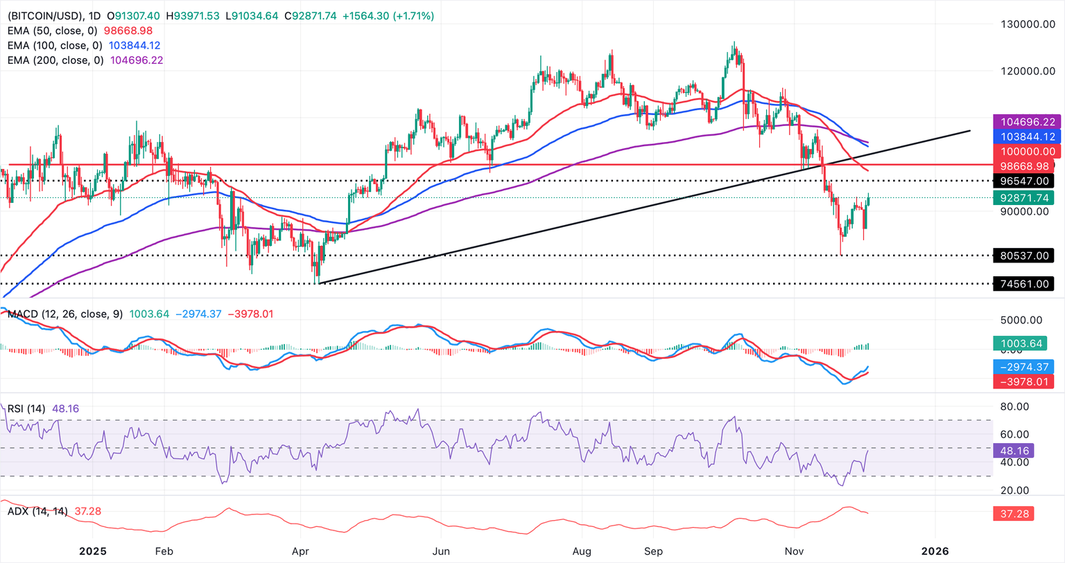 El Índice de Fuerza Relativa se sitúa en 48 (neutral) y está subiendo, una leve confirmación de un tono estabilizador. Una línea de soporte en pendiente ascendente desde 74.561$ fue rota cerca de 102.149$, señalando un cambio en el sesgo y dejando esa región como una barrera clave en los rebotes.
