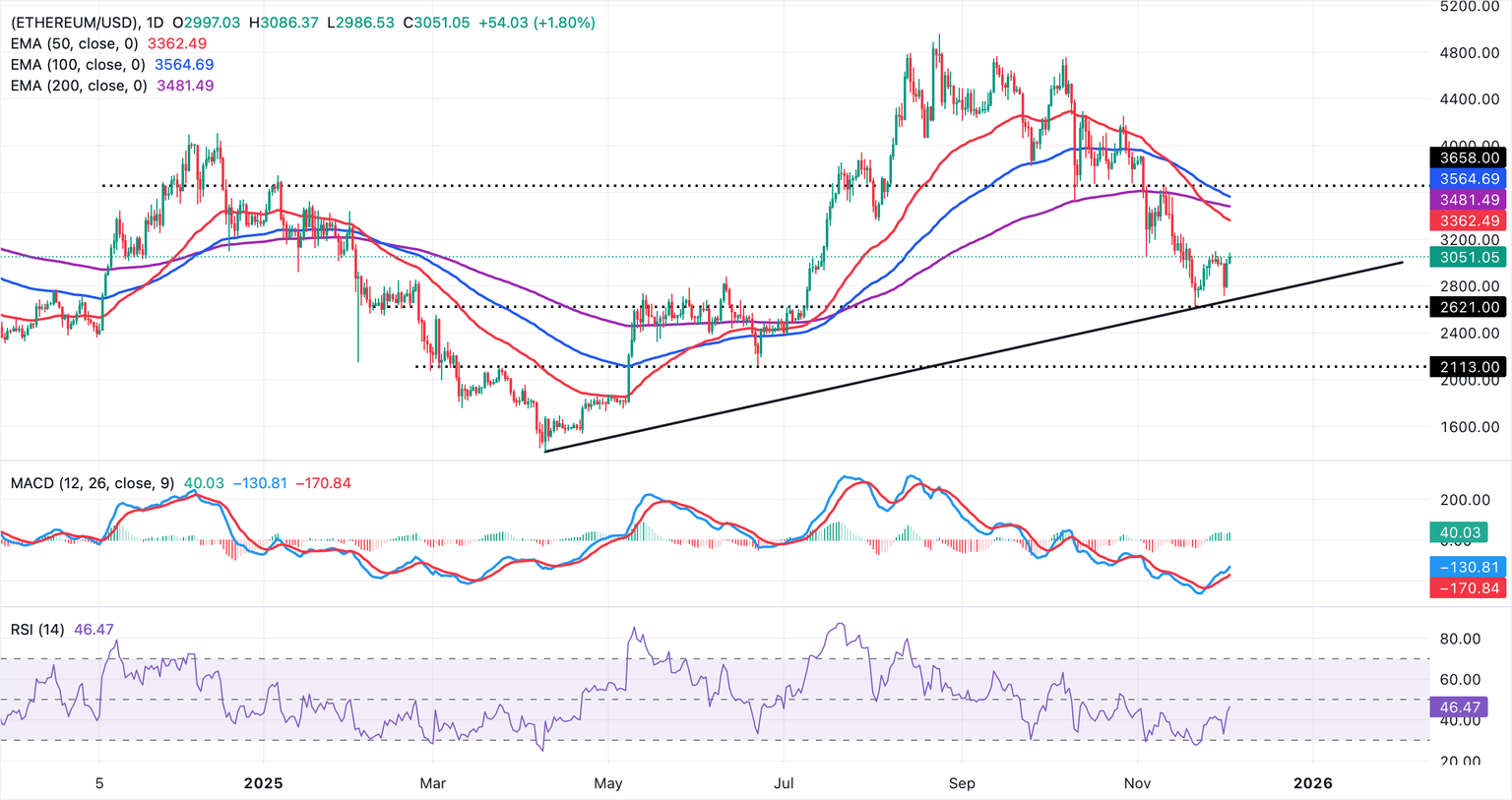 Ethereum está cotizando a 3.051$ en el momento de escribir este artículo el miércoles. También está posicionado por debajo de la EMA de 50 días en 3.362$, la EMA de 200 días en 3.481$ y la EMA de 100 días en 3.564$, lo que podría mantener los rebotes limitados y el tono más amplio suave. La secuencia de promedios más bajos subraya una tendencia bajista prevalente.