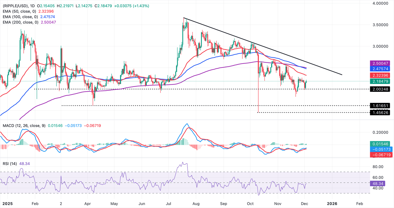 Por otro lado, XRP se intercambia a 2.18$ en el momento de escribir este artículo el miércoles, mientras se mantiene por debajo de las medias móviles clave, incluida la EMA de 50 días en 2.32$, la EMA de 100 días en 2.47$ y la EMA de 200 días en 2.50$. El histograma del MACD ha cambiado a positivo y se está expandiendo en el gráfico diario, con la línea azul por encima de la línea de señal roja, sugiriendo un impulso alcista en mejora. Al mismo tiempo, el RSI en 48 (neutral) está subiendo, indicando una presión bajista que se desvanece.
