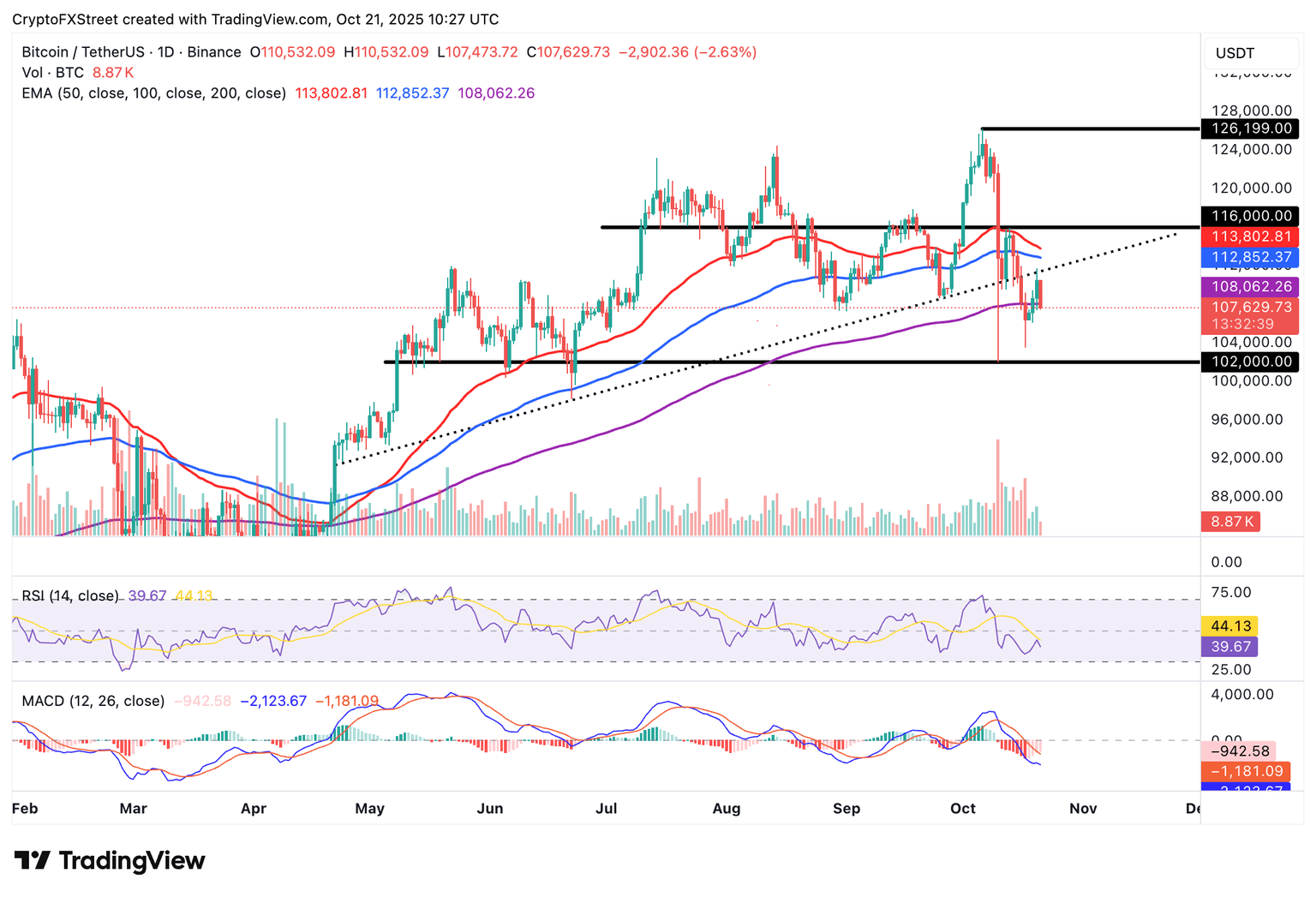 A medida que los bajistas estrechan su agarre, la tendencia a la baja del Bitcoin se extendió por debajo del soporte de la media móvil exponencial (EMA) de 200 días, actualmente en 108.062$ el martes. La caída recortó la mayor parte de las ganancias acumuladas con el Bitcoin, manteniéndose brevemente por encima de los 111.000$ el lunes.