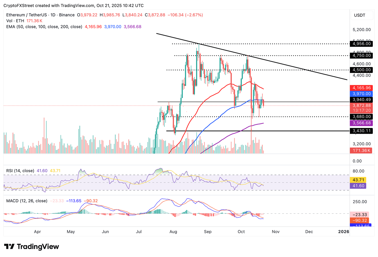 Ethereum está posicionado por debajo de la EMA de 50 días en 4.165$ y la EMA de 100 días en 3.970$ en el gráfico diario, sustentando una estructura técnica pesada. Un Índice de Fuerza Relativa (RSI) en tendencia a la baja en 41 en el mismo rango diario confirma que el impulso alcista se está desvaneciendo.