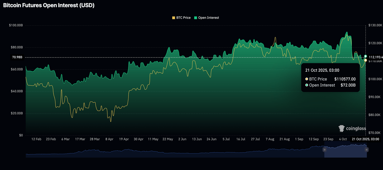 El interés abierto (OI) de futuros de Bitcoin ha bajado aproximadamente un 23% a 72.000 millones de dólares el martes después de alcanzar un máximo histórico de 94.12 mil millones de dólares el 7 de octubre, según datos de CoinGlass.