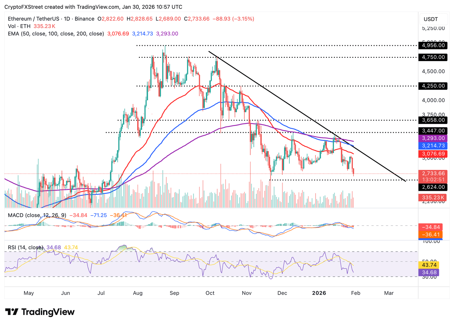 Al mismo tiempo, el RSI en 35 en el mismo gráfico está descendiendo hacia el territorio de sobreventa, subrayando el intenso impulso bajista. Ethereum necesita defender el soporte inmediato en 2.700$ para evitar pérdidas extendidas hacia su mínimo de noviembre de 2.624$. Aún así, los vendedores podrían mantener el control a menos que el precio rebote por encima del nivel crucial de 3.000$ y recupere la EMA de 50 días en 3.077$ como soporte.