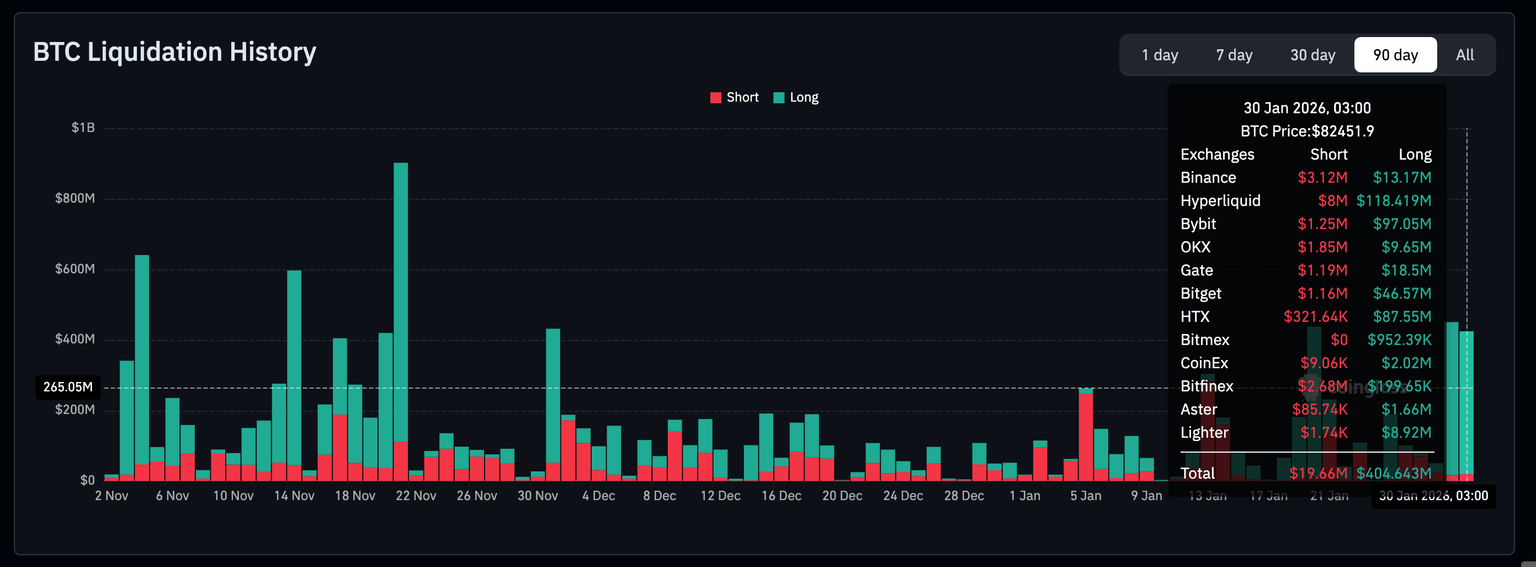 - El Bitcoin cotiza bajo presión, desencadenando casi 405 millones de dólares en liquidaciones largas en medio de tensiones geopolíticas y riesgos macroeconómicos.