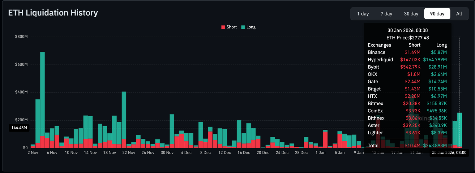Mientras tanto, Ethereum enfrenta ventas agresivas a medida que el precio extiende la caída por debajo de la marca de 3.000$ y se mantiene por encima de 2.700$ en el momento de escribir. Los datos de CoinGlass muestran liquidaciones largas de aproximadamente 244 millones de dólares el viernes y 175 millones de dólares el jueves.