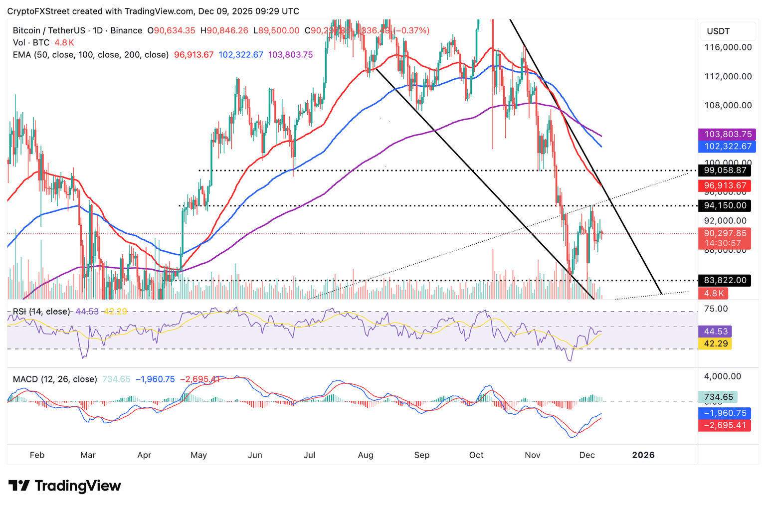 Bitcoin se está negociando por encima de 90.000$ en el momento de escribir este artículo el martes, mientras compradores y vendedores luchan por el control. La posición de Bitcoin por debajo de la media móvil exponencial (EMA) de 50 días en 96.913$, la EMA de 100 días en 102.322$ y la EMA de 200 días en 103.803$, socava su potencial alcista.