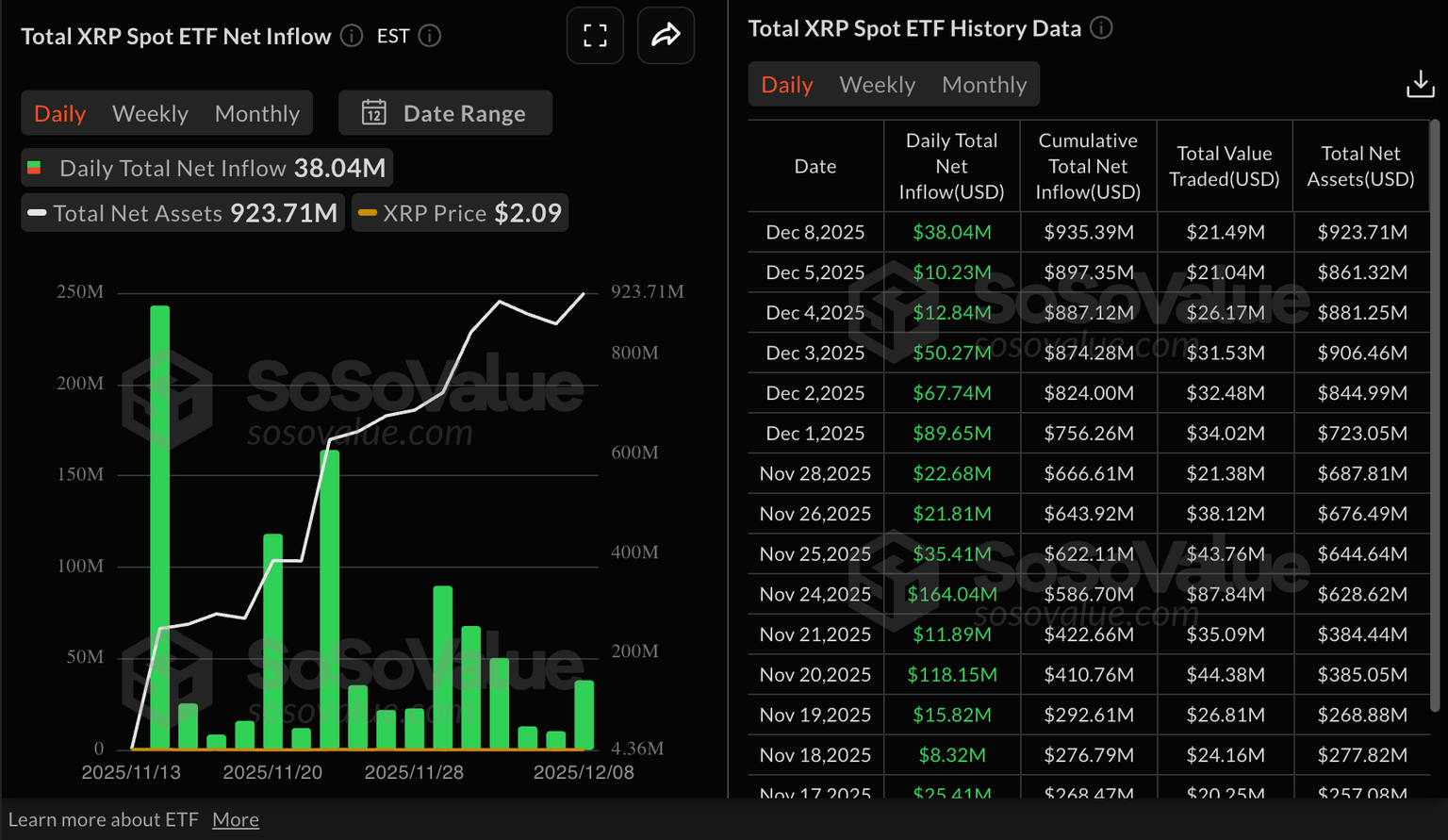Los ETFs de XRP extendieron su racha positiva constante con entradas totales de 38 millones de dólares el lunes. Desde su debut el 13 de noviembre, los ETFs de XRP no han registrado salidas, señalando un creciente interés institucional en productos de inversión en criptomonedas relacionados con altcoins. La entrada acumulativa promedia 935 millones de dólares con activos netos de 924 millones de dólares.