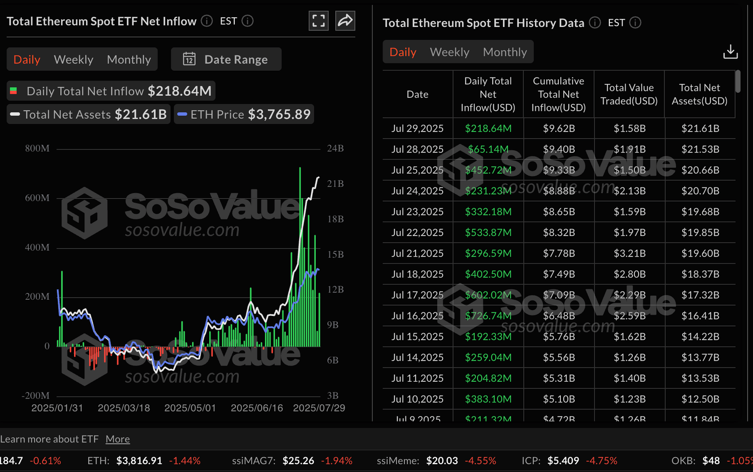 Mientras tanto, los ETFs de ETH al contado en EE.UU. atrajeron una entrada neta de alrededor de 219 millones de dólares el martes, continuando la racha alcista ininterrumpida desde el 2 de julio. La entrada total acumulada se sitúa actualmente en 9.620 millones de dólares, con activos netos promediando alrededor de 21.610 millones de dólares.