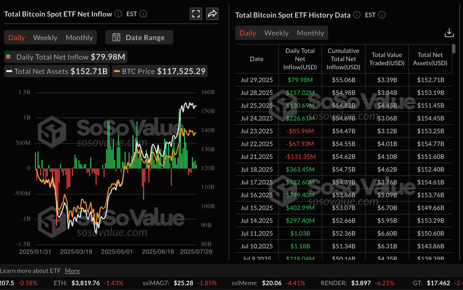 La demanda de ETFs de Bitcoin al contado en EE.UU. ha disminuido significativamente en la última semana, en comparación con mediados de julio, cuando el precio del Bitcoin se disparó, alcanzando un nuevo máximo histórico de 123.218$. A pesar de la disminución en el volumen, ha habido cuatro días consecutivos de entradas, con aproximadamente 80 millones de dólares registrados el martes. La entrada total neta se sitúa en 55.000 millones de dólares, con activos netos promediando alrededor de 153.000 millones de dólares.