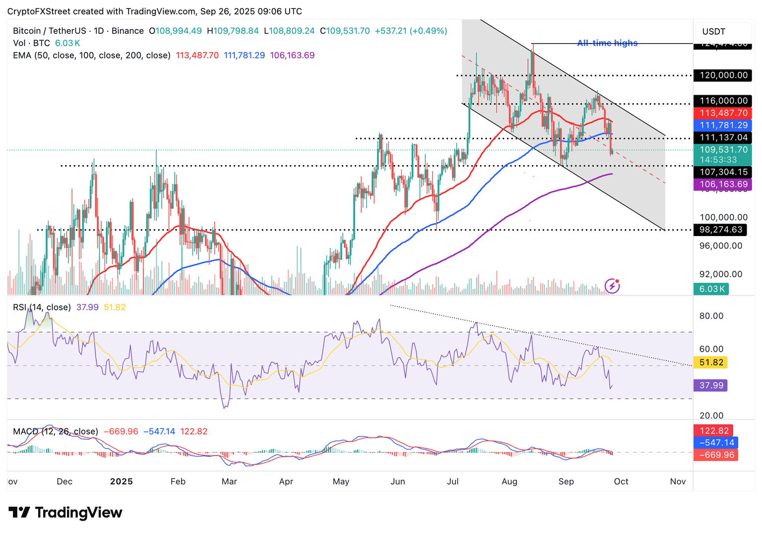 El precio del Bitcoin también está posicionado por debajo de la media móvil exponencial (EMA) de 50 días en 113.487$ y la EMA de 100 días en 111.781$.