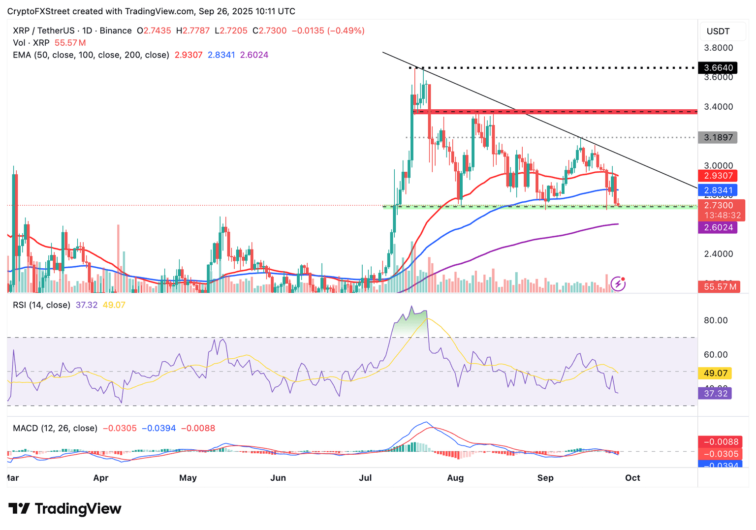 En cuanto a XRP, los osos están en gran medida en control en el momento de escribir el viernes, subrayado por una señal de venta mantenida por el indicador MACD desde el lunes. Una caída constante en el RSI a 37 refuerza el control bajista a medida que el impulso alcista se desvanece.