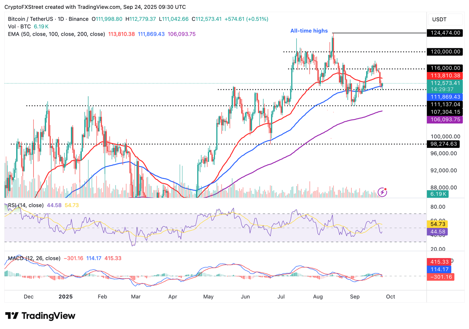 El Bitcoin se mantiene por encima de la EMA exponencial de 100 días en el gráfico diario, que proporciona soporte inmediato en 111.869$. Una vela verde ha impulsado el precio por encima del soporte de número redondo de 112.500$, destacando sutiles signos de recuperación.