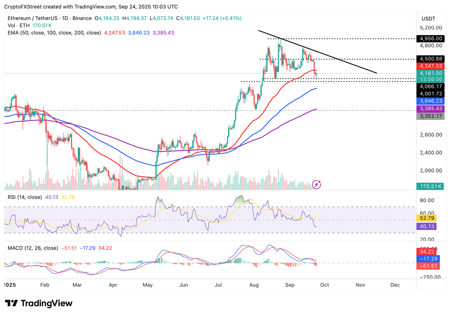 - Ethereum lucha por mantenerse por encima de 4.100$ a medida que el sentimiento de aversión al riesgo se manifiesta en las salidas de ETF.