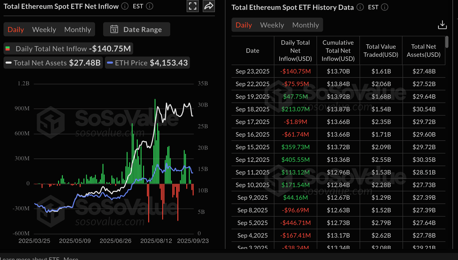 Según los datos de SoSoValue, los ETFs de ETH en los Estados Unidos (EE.UU.) vieron salidas de aproximadamente 141 millones de dólares el martes y 76 millones de dólares el lunes.