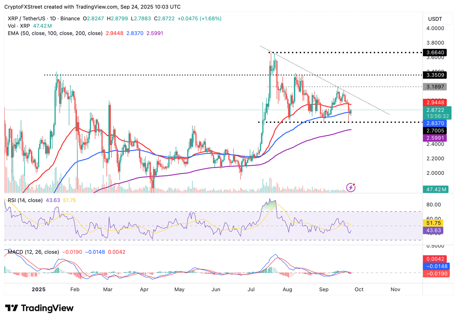 En cuanto a XRP, los alcistas muestran signos de recuperar el control después de seis días consecutivos de caídas. El gráfico diario destaca un nivel de soporte a corto plazo en la EMA de 100 días, alrededor de 2.83$, subrayado por un RSI orientado al alza en 43.