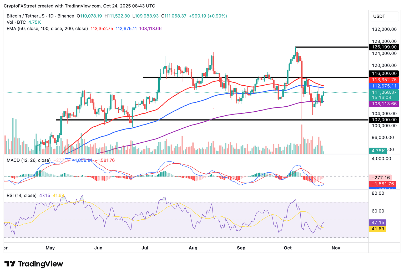 Bitcoin está extendiendo su pierna al alza por encima de 111.000$ en el momento de escribir, ya que el apetito por el riesgo regresa lentamente en el mercado de criptomonedas. El cruce alcista del Índice de Fuerza Relativa (RSI) y su posición en 47 en el gráfico diario indican que el impulso alcista está listo para aumentar.