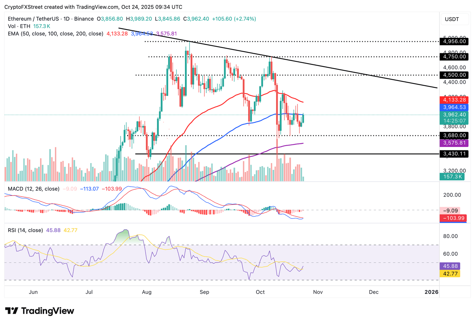 Ethereum está ganando lentamente impulso hacia la marca de 4.000$ mientras los alcistas luchan contra la resistencia en la EMA de 100 días en 3.964$. Este es el segundo día de recuperación constante, mientras los alcistas trabajan para recuperar el control.