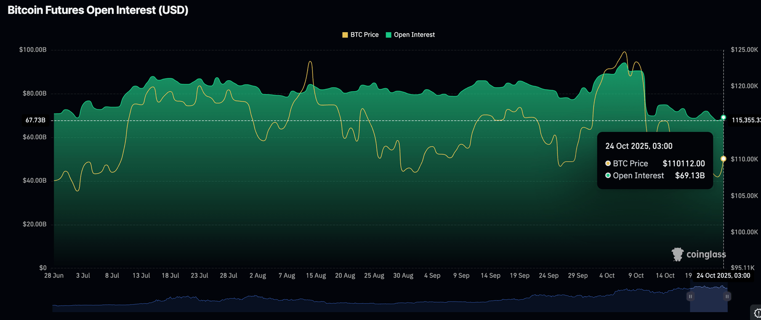 El mercado de derivados de Bitcoin se ha estabilizado en las últimas dos semanas, tras el mayor evento de desapalancamiento el 10 de octubre, que liquidó 19.000 millones de dólares en activos criptográficos. El interés abierto (OI) de los futuros de BTC promedia 69.000 millones de dólares, en comparación con aproximadamente 90.000 millones de dólares el 10 de octubre. Esto también marca una ligera mejora en la demanda de futuros desde un mínimo de 67.700 millones de dólares registrado el jueves, respaldando una demanda minorista estable.