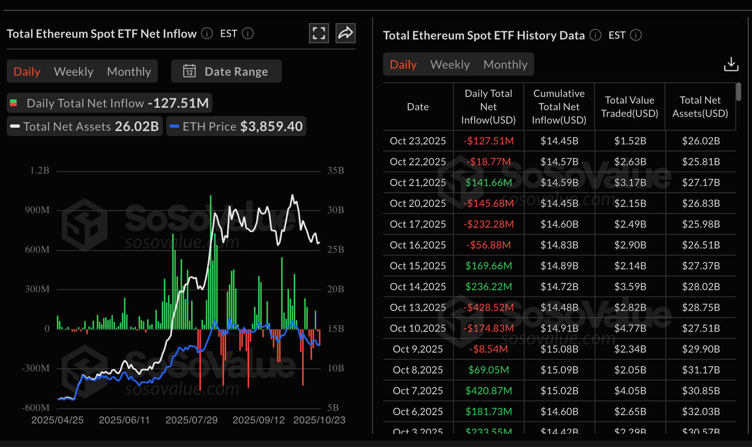 Aparte de la entrada neta del martes de 142 millones de dólares, los ETFs de Ethereum han experimentado salidas constantes cada día hábil desde el 16 de octubre, subrayando la falta de convicción en la recuperación a corto plazo del activo.