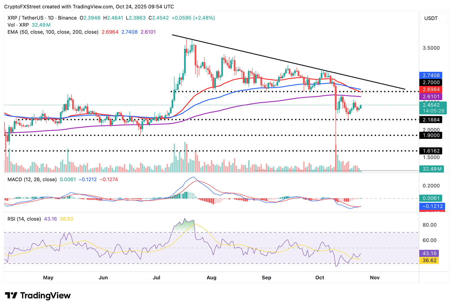 En cuanto a XRP, los alcistas están tomando el control intradía de la tendencia, impulsando el precio por encima de 2.45$ en el momento de escribir. El RSI en 43 y en aumento en el gráfico diario respalda el impulso alcista a corto plazo, con un breakout por encima de la EMA de 200 días en 2.61$ en el foco.
