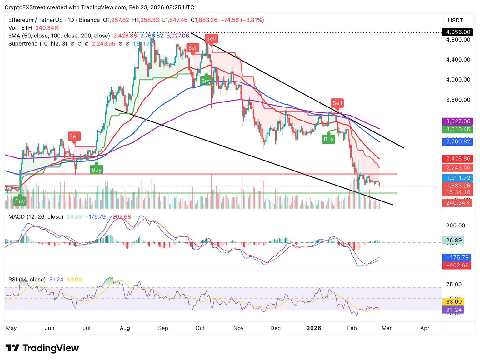 Ethereum está cotizando por debajo del soporte convertido en resistencia en 1.900$ mientras se mantiene por encima de su mínimo intradía de 1.847$. El token líder de contrato inteligente también se sitúa por debajo de la EMA de 50 días en 2.428$, la EMA de 100 días en 2.767$ y la EMA de 200 días en 3.027$.